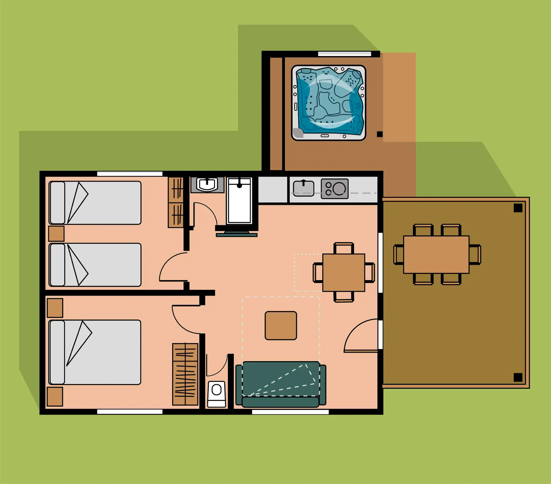 Además de sus 38 m² interiores perfectamente distribuidos y su terraza cubierta de 12 m², incorporan un jacuzzi privado exterior, ideal para relajarse después de una jornada de senderismo o simplemente disfrutar de un momento de desconexión bajo el cielo de Navarra.