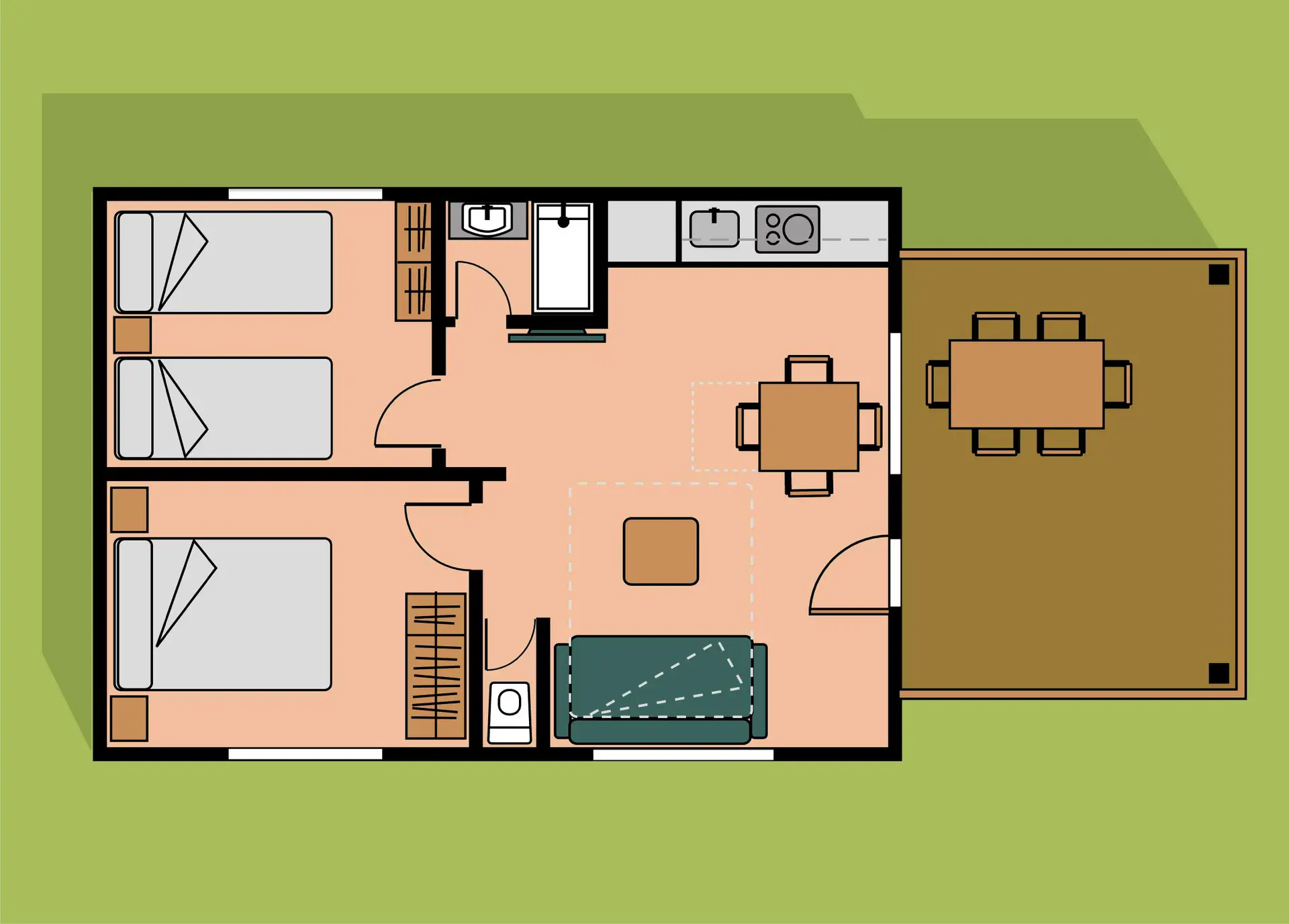 Con 38 m² útiles y una espectacular terraza cubierta de 12 m², ofrecen un espacio amplio y elegante para disfrutar en familia o en grupo. La distribución incluye dos habitaciones independientes, salón con sofá-cama de matrimonio y una cocina americana totalmente equipada. Además, cuentan con baño completo y aseo independiente, aportando mayor comodidad y privacidad.